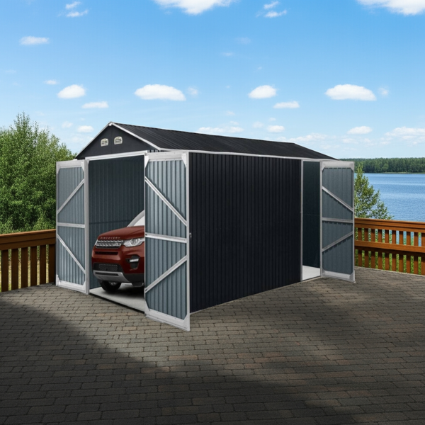 Puerta doble extra ancha y alta con bisagras para facilitar el acceso y con pestillo seguro con cerrojo y grapa para seguridad, una puerta lateral corrediza que brinda mayor comodidad y ventilación para el flujo de aire, 0,25mm panel de acero galvanizado, 0.5-0.8mm marco de acero galvanizado en caliente, Puertas dobles extra ancha y alta.
