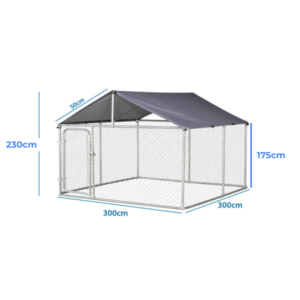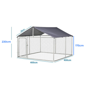 Canil para perros con cerradura para exteriores de acero galvanizado. Mantenga a sus perros seguros y protegidos con esta perrera. El canil está hecho de malla de alambre galvanizada y tubo galvanizado, el techo está elaborado en tela impermeable que protege al perro de la penetración directa del sol y lluvias ligeras, resistente a la humedad y a la corrosión y de fácil armado.